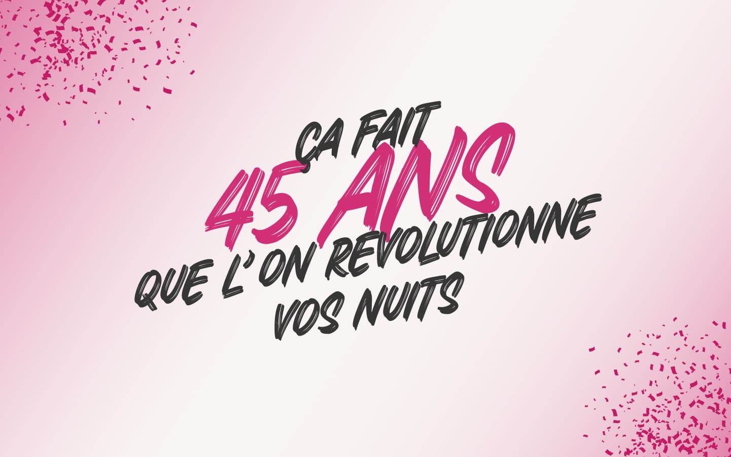Depuis 45 ans, nous imaginons vos nuits pour qu’elles soient parfaites… et pour vous remercier, profitez de remises exclusives et tentez votre chance à notre jeu anniversaire pour remporter des cadeaux surprises !