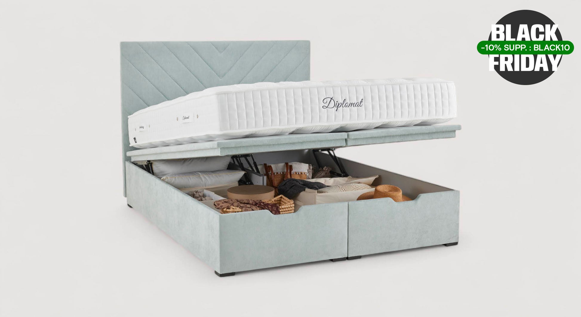 Le lit coffre Écrin est le sommier rangement idéal pour gagner de l'espace chez soi. Ce modèle haut de gamme assure de belles nuits de sommeil et une chambre à la finition élégante.