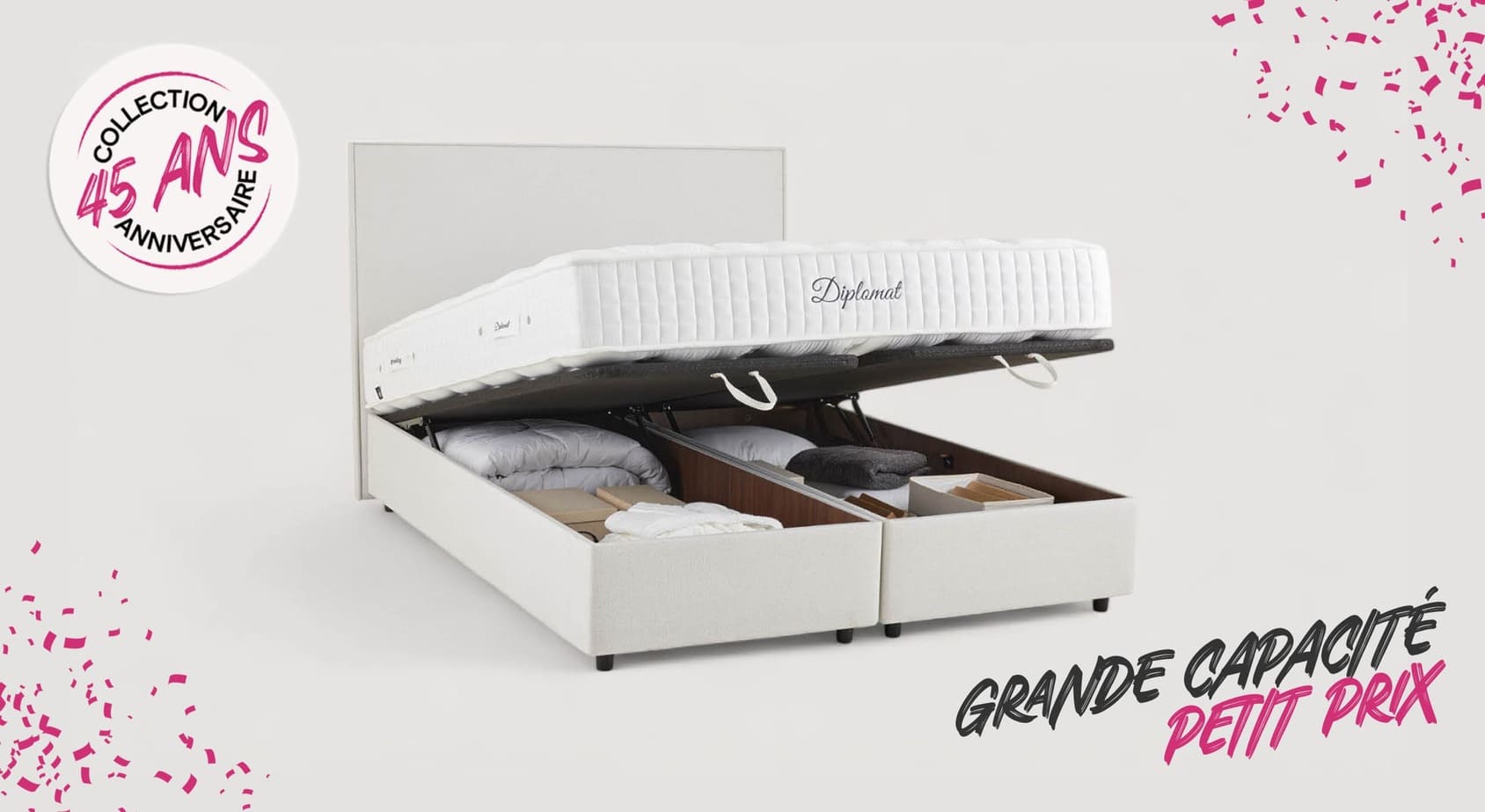 Le sommier coffre de rangement Nina est idéal pour ceux qui cherchent à allier confort et fonctionnalité. Avec sa large capacité de rangement et ses vérins haut de gamme, ce lit coffre assure une chambre rangée avec un sommier qui dure dans le temps.